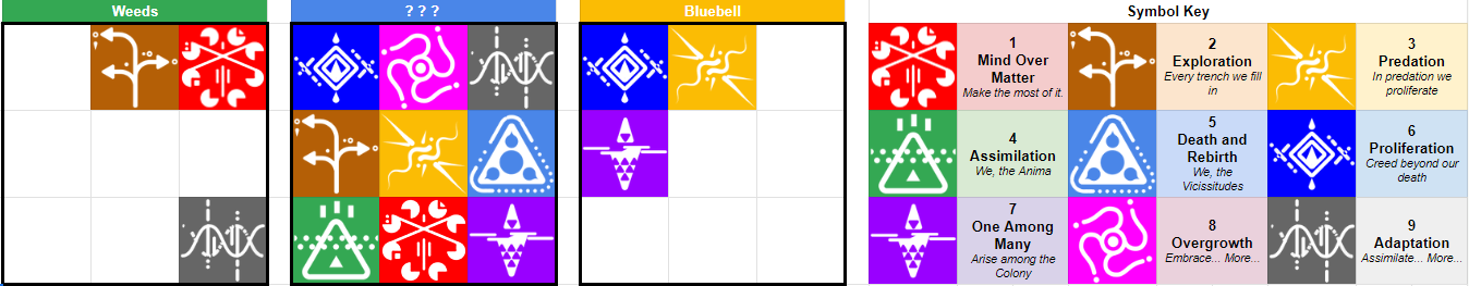 [ On this section of the wall, between the weeds' and bluebell's grid, a 3 x 3 grid has . . . no flock's name on it. strange.